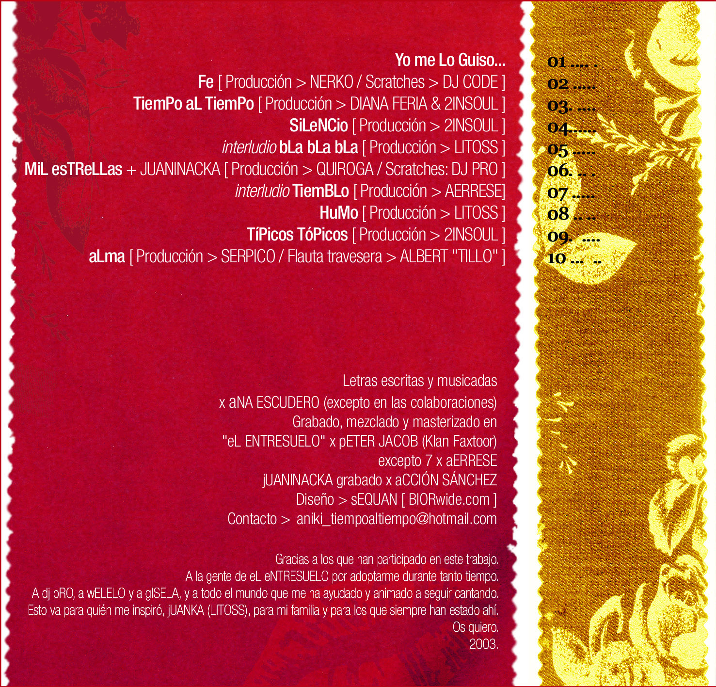 y la calidad lirikal de los temas, tiene comparazion matias (no registrado, email), 3-7-2009 6:26aniki deslumbrante lo que haces, me da gusto averme topado con tigo en este camino. desde el bolson la patagonia argentina. PAZ. fufi (no registrado), 7-9-2009 13:21tiempo al tiampo es la mas llegadora y más si estas en momentos criticos, te hace sentir como si volaras carolina (no registrado), 15-11-2009 7:04superrrrr alikante (no registrado, email), 4-7-2010 2:47un disco de puta madre es bueno ver que un underground no s erinde nunca sativa (no registrado), 15-9-2010 14:54gracias por el aporte, yo escuche aniki con rapsus en un mundo bicolor y me molo, tiene una gran voz, si no la conoceis escucharla seguro que os gusta Coquito (no registrado), 22-6-2014 9:26Es muy mala según mi opinión esta maketa.